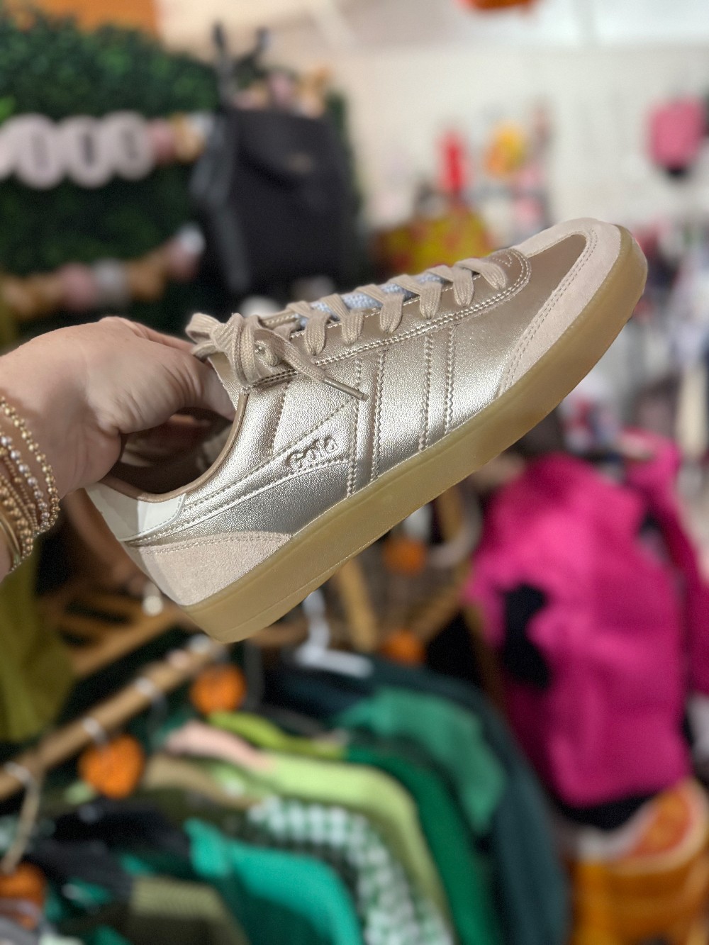 From Gola: The Viper combines a sleek short T toe upper with a gum sole on a gold leather silhouette, paired with a matching gold wingflash side trim. The new metallic edit from Gola is set to be an instant must-have.