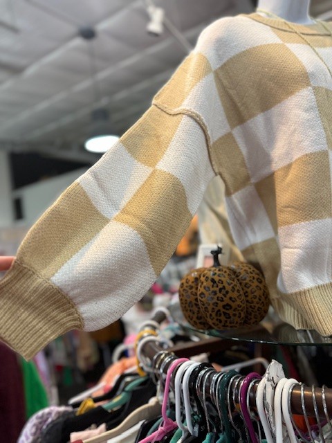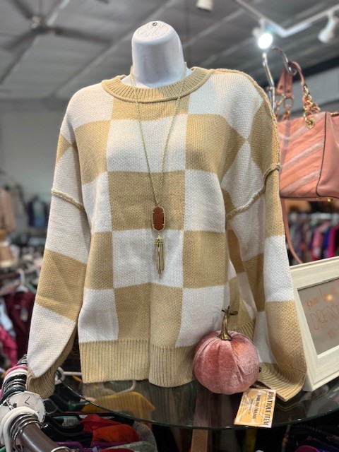 Elevate your wardrobe with this stylish checkered sweater. The bishop sleeves add such a cute touch. Crafted with premium fabric for a luxuriously soft feel. Dress up with leather booties or dress down with leggings and Uggs!