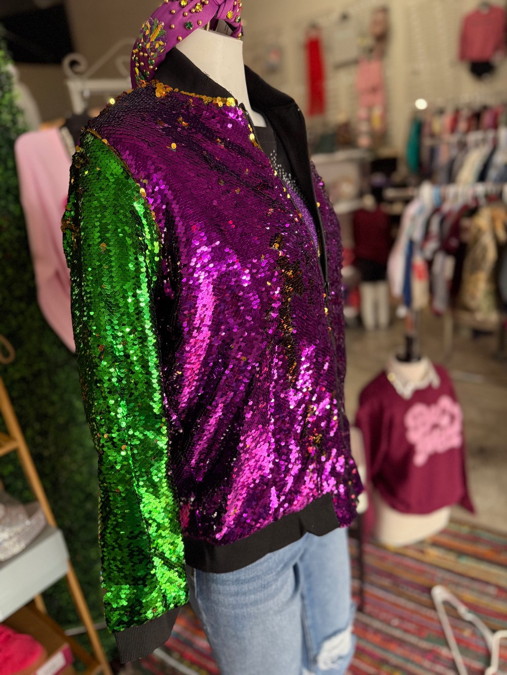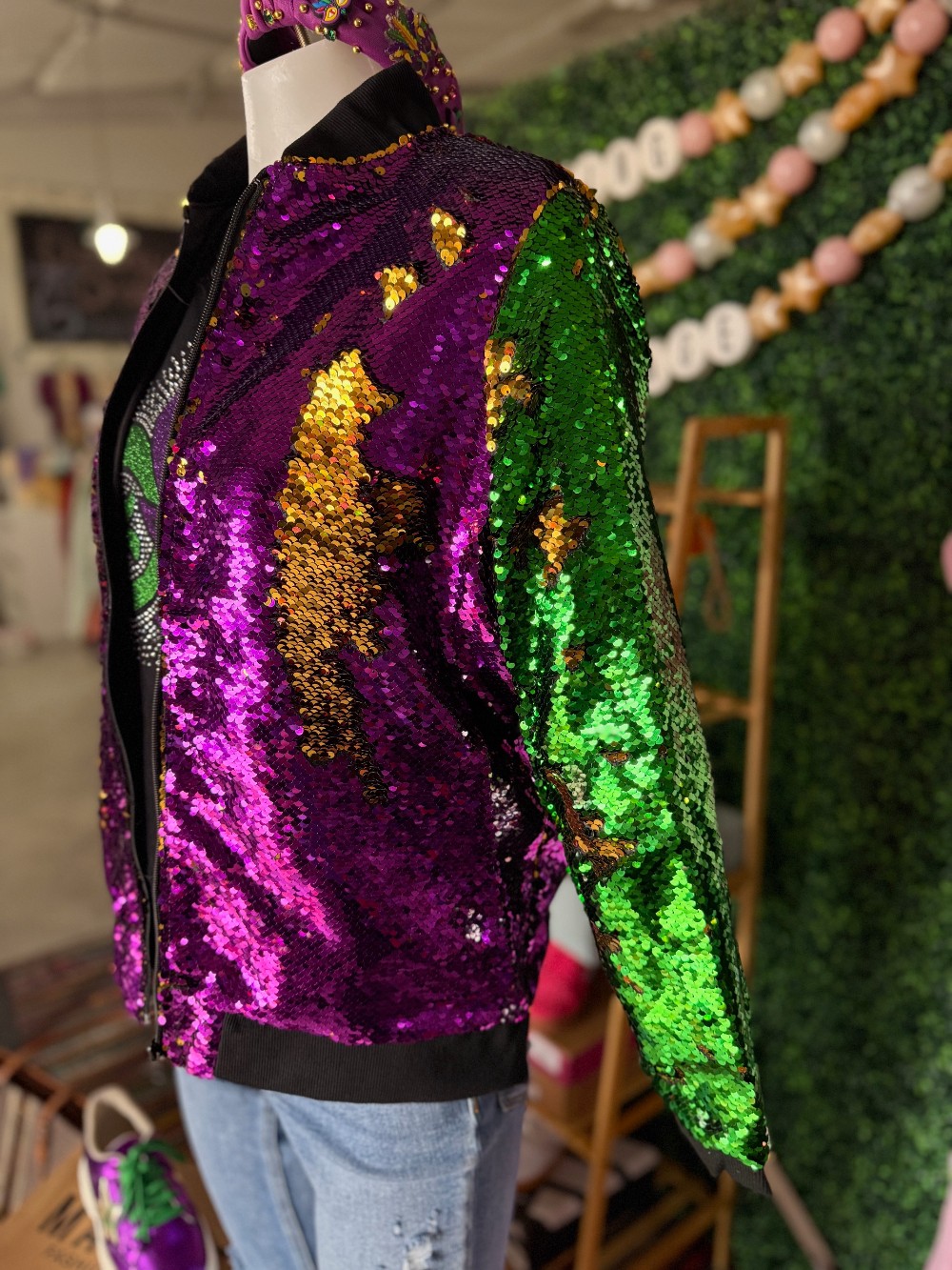 A full sequin bomber jacket just screams Mardi Gras! Sequins are "reversible" in that they flip to show gold. Perfect for every Mardi Gras event or the big parade!