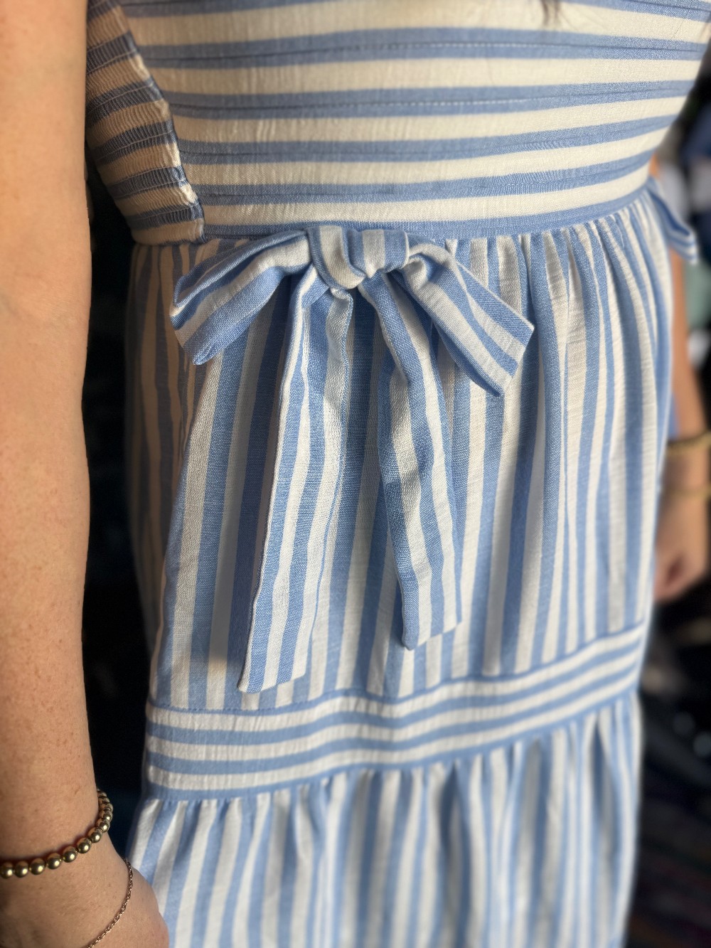 This striped maxi with little bow details is the perfect outfit for Easter or your next spring event. Fit is TTS.